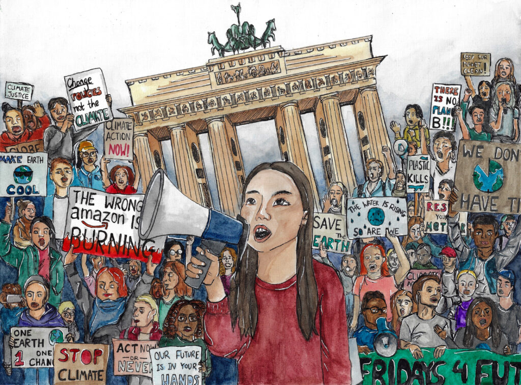 Growing up partially in Berlin has profoundly shaped my worldview. I strongly believe in the interconnectedness we all share as human beings: our actions inspire others, and vice versa. This belief has driven me to attend various protests, start our school’s Art and Climate Club, and raise awareness about global warming. My commitment to collective action fuels my efforts, and I believe that once the first step is taken, others will join in on the journey. This trust in people's concern for global warming is the driving force behind my current climate advocacy, which I aimed to capture in "Around the Brandenburg Gate." The power of the individuals around me (illustrated by the protestors in my piece) inspired me deeply to keep moving forward using art and my devotion to actions. It is through continuous efforts that others will follow and stand united. Ultimately, I want viewers to see my piece as a beacon of hope and a testament to the potential of collective action. Everyone in my artwork is united by a common purpose—climate advocacy—despite their diverse backgrounds and lives. My initial step brought them together, and in the future, it can be yours too.