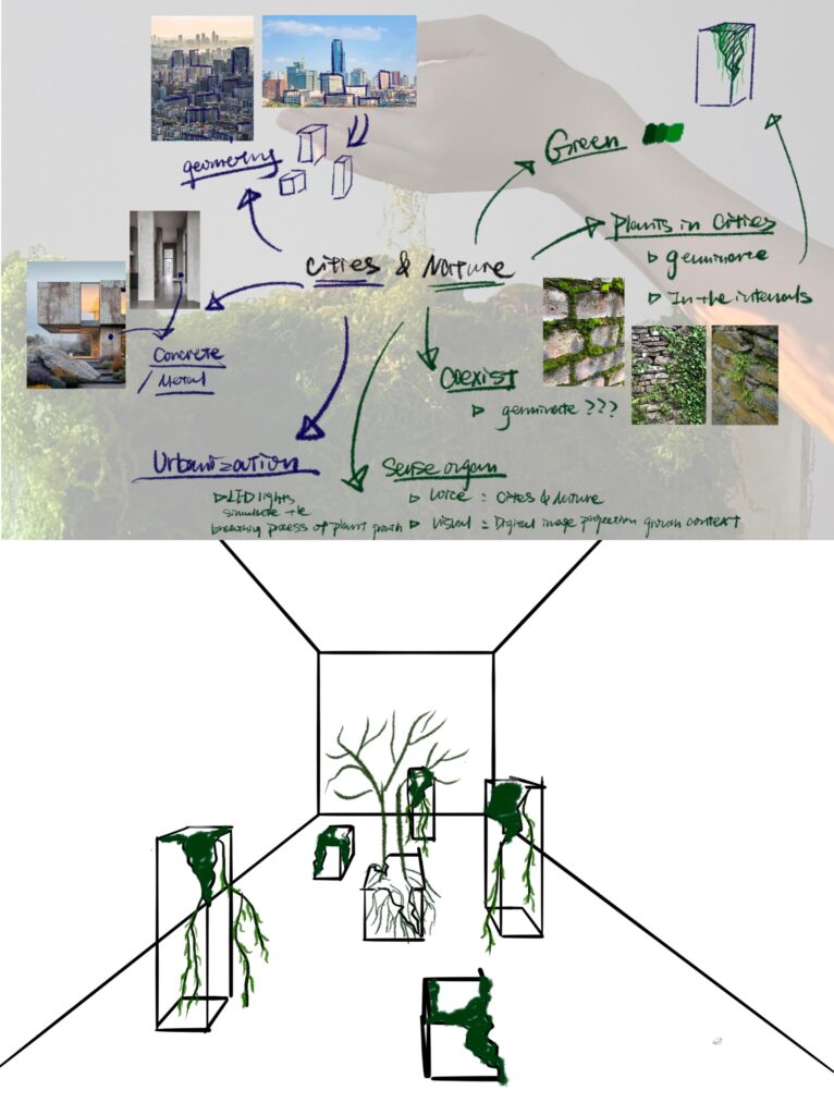 Project Description: My installation explores the tension and potential harmony between urban development and nature in the age of the “Concrete Jungle.” I constructed the base using stacked cardboard rectangles of various sizes, forming a cityscape of simplified, block-like buildings. To simulate the harsh texture of concrete, I applied layers of tissue paper and painted over them with acrylic paint in muted gray tones. These represent the artificial and rigid structures of modern cities. However, life finds a way. Emerging from the cracks between the buildings are small plants, symbolizing nature’s resilience and its will to coexist, even in the most hostile environments. What truly brings the piece to life is an interactive component. The digital projection uses generative algorithms to translate the growth patterns of plant root systems into a flowing particle system. These luminous traces spread across the ground and pillars, forming an ever-evolving virtual ecosystem. Hidden within the rooftop vegetation is a programmable LED strip controlled by Arduino. Under normal conditions, the installation remains dim and desolate—urban, sterile, and seemingly lifeless. But when a viewer approaches, sensors trigger soft green lights to pulse in a slow breathing rhythm. It’s as if the greenery is coming alive, regaining its breath in response to human presence. The work seeks to move beyond a simple binary opposition, presenting a more nuanced state of symbiosis. Rigid geometry and organic forms, static structures and dynamic light, human intervention and natural growth—these elements engage in a layered dialectic. Through this immersive experience, the audience is invited to reflect: Amid the inevitable process of urbanization, how can we become participants in the ecosystem, rather than its conquerors?