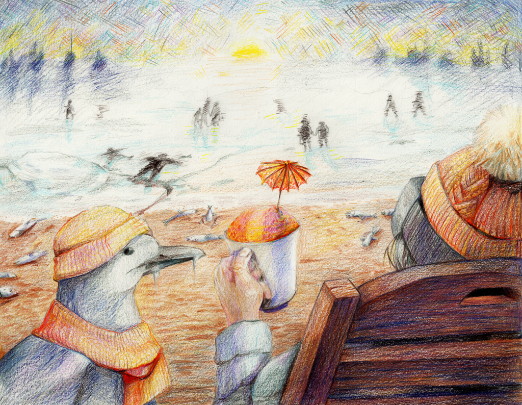 Living in the bay area, going to the beach every so often is a privilege I have - being able to enjoy and experience our natural environment all seasons of the year. Nature deeply inspires me, and I wanted to create an image that reflects on the dissonance of rapid climate change. Research even shows that impressionist artists of the past (like Monet) could have observed smog in the air and it's had an impact on their art. The environment is changing rapidly for the worse, many artists are aware of that and reflecting on it. Beaches are known for warm weather and splashing waves, so going to the beach to find a natural skating rink may confuse some people. Climate change is much more complex than some may think, the weather isn't just getting hotter, in some areas it's becoming inhospitable and colder not only for humans but for animals, we'll be forced to rapidly adapt our lifestyles while those unable to adapt will die (and perhaps get washed up on the shore). All forms of life will be affected, especially those in the ocean. Perhaps we won't be able to enjoy sunsets on the beach anymore with all the smog in the air. Being aware of my individual actions and encouraging others, donating to fundraisers, raising awareness by speaking out and participating in Earth Day events, are all ways I and many others can combat climate change. Although the setting portrayed here may look dystopian, it could be our future, and it's one I want to avoid.