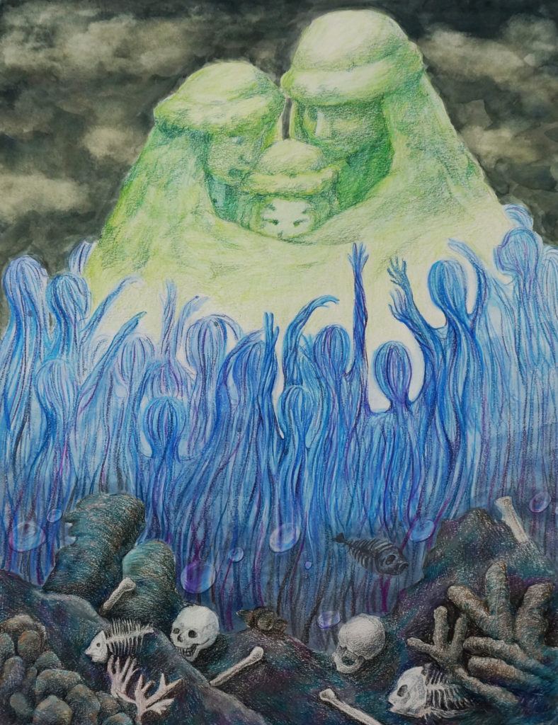 In my drawing, I made the water and the land in human form to create fear. The top of the drawing is land. They are huddled together in fear because the water is attacking and sinking the land like zombies. The skeleton fishes and the skulls represent ‘Death’ that is caused by ocean acidification from the warm waters. Right now on our Earth, the sea levels are rising because the ice in the north is melting from climate change. To stop this global warming, we should not make the Earth heated. We have to stop burning fossil fuels. I will work hard to protect our land.