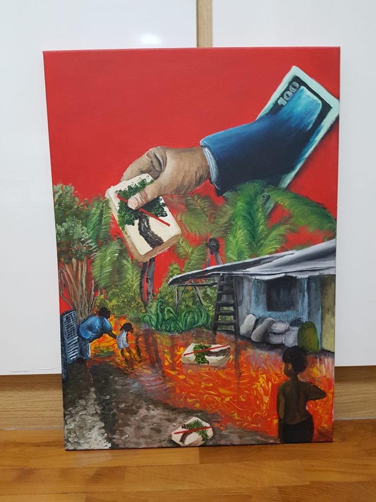 This is a picture of Kiribati, an island that’s about to be submerged forever. To signify this danger, I painted the sky red. The water is red as it reflects the sky. To show that it is us who cause global warming, I drew a business man's hand. Trees are being cut down or burned to make money (represented by the crossed-out tree on the domino), so the hand is coming out of the $100 bill. The cutting down and burning of trees contributes to global warming, which causes icebergs to melt and the water level to rise. After learning about this, I have decided to not waste water and to do my part in saving the earth.