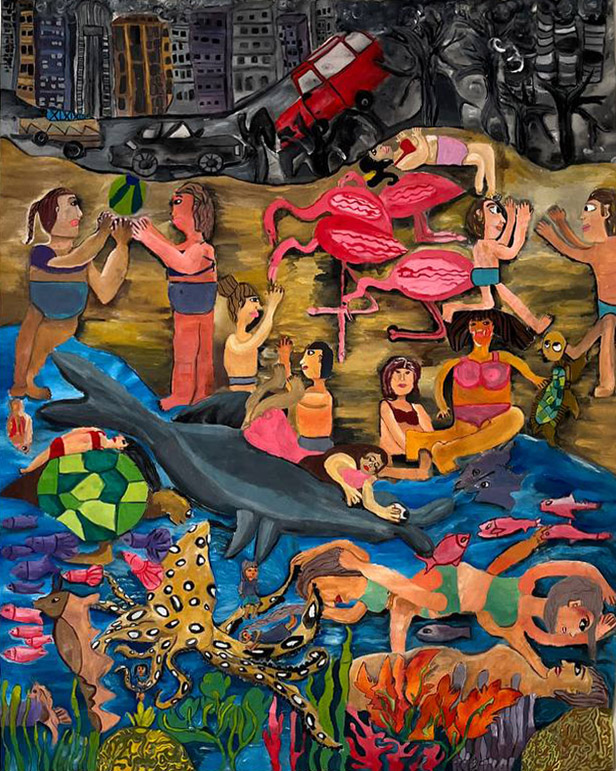 One day, the air in the city was so polluted that schools were closed. So my friends and I decided to escape the dirty air and go to the beach. When we got there, we saw flamingos and a dolphin! We really wanted to play with them, feed them, and swim in the water. We made this painting with gouache on canvas fabric, all together. We wanted to show that we should take care of nature and the animals — because they have the right to live, just like we do.