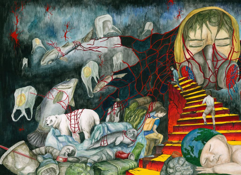 Through my artwork, I want to depict how the rising level of global warming is affecting future generations. The current population is slowly but surely heavily polluting the environment which then gets passed onto children and teens. These group of future leaders can never see the Earth the same way as we did. As adults, we have to accept the reality that we are killing ourselves and taking the whole planet down with us. In the next passing years, the community will never get to experience what taking a deep breath of fresh air or staying home on a snow day will feel like. Because of all the pollution by factories and trash in the waters, the Earth will never be the same again. Everyone can see how our once beautiful blue and green home planet is now turning into an unstable environment. Many citizens and the government, do not realize how much we have dug ourselves into this mess, and trying to recover the planet will only get harder, eventually reaching the point where it is not an option to go back. I desperately want to help in any way: planting trees, picking up trash, and etc. If the population did simple tasks like these, our home would be in a much better situation then it is right now. Every bit of help we can get, even just one person, can make a big difference. Any action that can lead the people in the right direction is needed. It is now or never.