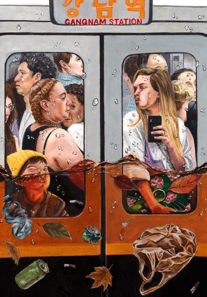 The artwork “Gangnam station” illustrates the results of climate change and what human species might experience in the future because of it. This artwork raises awareness by amalgamating the concepts of waste mitigation, weather disasters, and the repercussions that humans will undergo, which are induced by climate change. As you can see in the artwork, the people in the subway are agonized by the discomfort that they are confronting, and the fact that those pain are caused by climate change emphasizes the climate calamity that we are going through. This work was inspired by the climate disaster that I personally experienced, which happened in South Korea, in the summer of 2023. Specifically in Gangnam, the big flood happened that was induced by abnormal climate, and one of the moments that I can not forget is a subway that passed the inundated Gangnam station. I was a passenger on that subway, and by recollecting the memory, I remember that the subway was passing the sinking station at slow speed, so that I can see all the detailed situation of what's happening. It was total chaos, people were screaming and scared by it. I was traumatized and shocked by the fact that climate change can directly impact humans' lives. Before the incident, I only thought that the climate catastrophes were exaggerated, which has a low probability of happening in real life. However, now I perceive climate change as a very serious problem that human species are dealing with. In my opinion, it can have a huge impact on an individual's life and, by extension, the existence of humans. Therefore, I draw this artwork to share my experience in a more dramatic way and give an idea of the seriousness of climate change. I had a strong desire to recreate the terrifying happening that I experienced in art, which I believe as another type of language where people can communicate their emotions and feelings. I hope this artwork can evoke the emotion of sadness and also feel my desperation to save the environment. If we don’t take any action to overcome this situation, we might suffer from the discomfort that I described in artwork daily. In conclusion, I think as a teenager artist, we should be engaging in climate change issues more enthusiastically so that young children and governments can also have an interest in this topic.