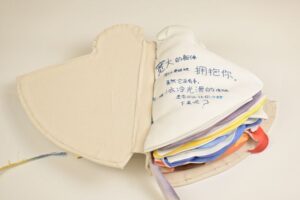 Staring at a real-life manta, its beauty and gentleness enchants me. I can’t help but wonder if their wide bodies are there to hug and calm people down. Therefore, I imagined a type of manta that takes emotions as their main source of food in return for healing others, and their appearance would transform according to the kind of emotion they consume. The manta’s symmetrical body inspired me to make this piece into a book.In order to express manta’s gentleness, I used watercolor paintings printed on fabric as the main material, and decorated each manta with eyes I created myself using resin. The very first page of this book includes a paragraph I wrote and stitched, it says: “A broad body can embrace you better. Although it has no hands, can its cold, smooth skin help you calm down?”