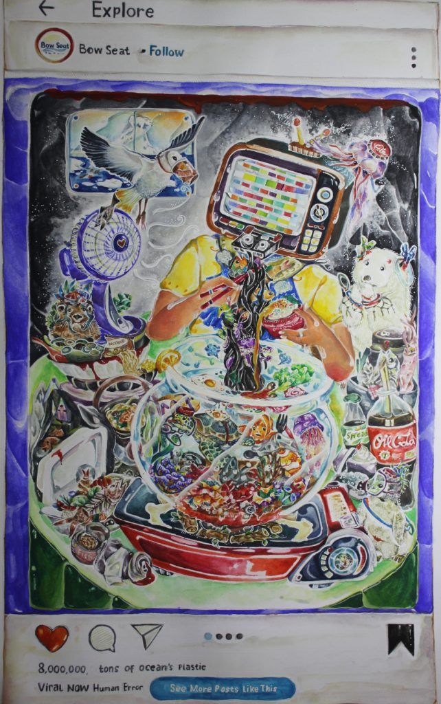 The modern era is defined by the rapid development of technologies. It’s a gift but also a disaster when we become very greedy and exploit nature. I describe a television-headed man as a symbol of the current trend, the mukbang “all you can eat” trend. The stove represents global warming that boils the bowl of the aquarium, which is a small form of the ocean ecosystem. We add some instant seasoning that forms as plastics in the ocean. We have to increase our social awareness, especially among the younger generation. I believe that if we don’t have the power to reduce ocean pollution yet, at least we can try not to worsen the problem. Let’s do the smallest and simplest things first by reducing food waste, not using disposable plastic, recycling, and spreading messages about rescuing the ocean using social media.