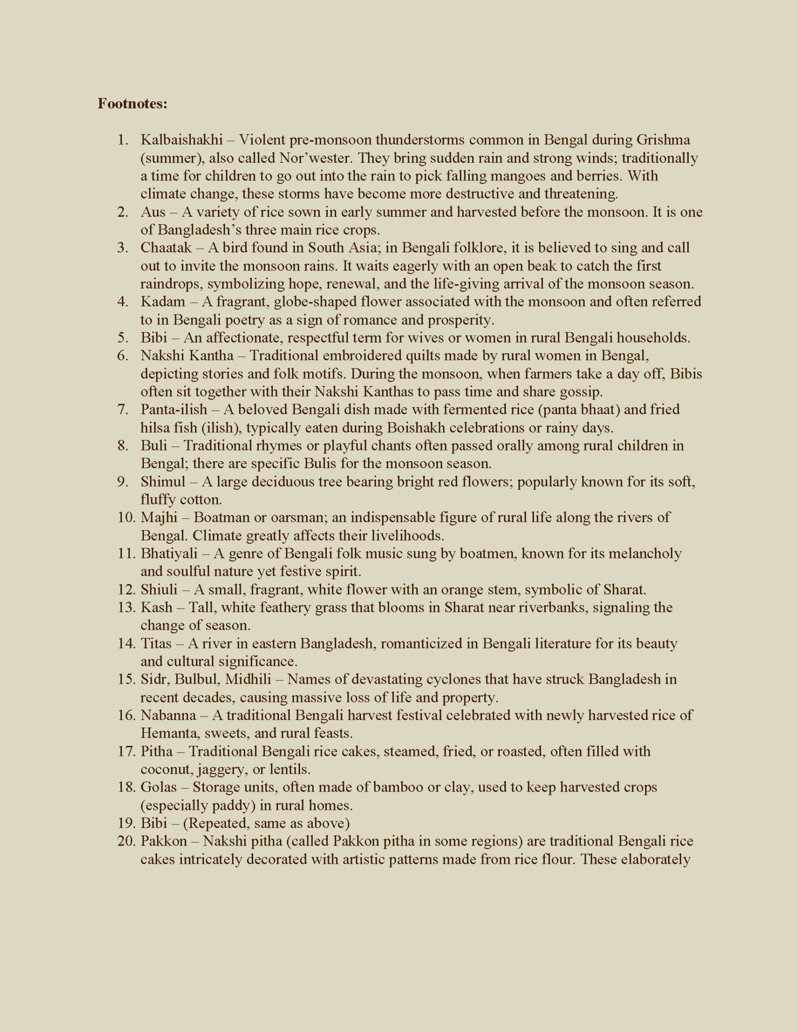 “I Dream In Six Seasons” is written from the perspective of a rural Bangladeshi Farmer. They don't just 'dream', they live in six seasons. It shapes their lives and livelihoods. It effects the Tantis, Majhis, Jeles and Bibis too. Bangladesh is the only country with six whole seasons; each season brings something totally unique and different. They shape our stories, festivals, food, and rich literature. But now, seasons blur. I see my country bearing the brunt of a crisis it didn’t create—our fields drowning one month and cracking open the next. Through this poem, I tried to mourn what’s slipping away: not just nature, but heritage. This is my love letter to my rural Bangladesh, to honor oral traditions and seasonal storytelling. Each stanza follows a rhythm of remembrance and grief, where memories of harmony clash with the harsh reality of climate collapse. I used vivid rural imagery and folk references because that is where I see climate change most clearly—not in headlines, but in the eyes of farmers, fishers, potters, and weavers whose lives are unraveling. Climate is weaved through the people's lives so inexplicably deep. When it falters, the people do too. I cried when I finished this poem. Writing this made me realize even more profoundly that environmental loss is not abstract—it is deeply cultural, spiritual, and generational. Through this exploration, I better understood what “connection to nature” truly means: it is our laughter during Kalbaishakhi storms, the way we celebrate Nabanna with syrupy sweets, or how magpies whistle by the mustard fields. It is what sustains us—until it doesn’t. My message is simple: If we lose our seasons, we lose a part of who we are. But dreaming can be an act of defiance. I want this poem to remind others that climate change is not only science—it’s poetry, memory, and survival. And perhaps, we can still recover what’s left to save.