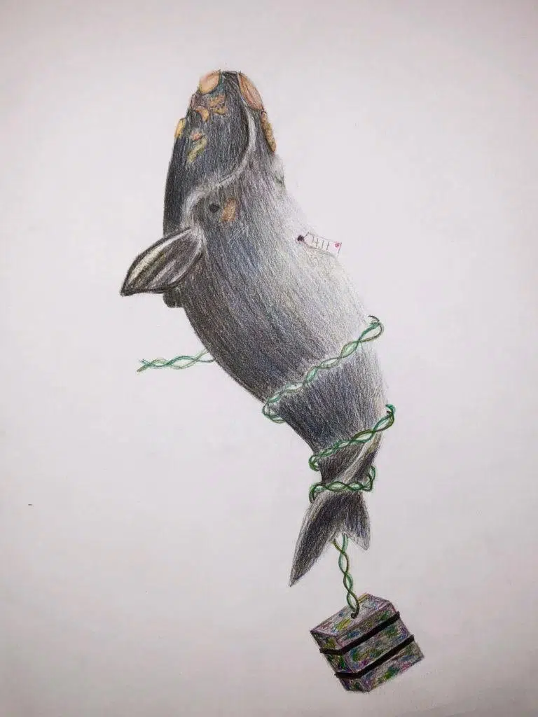 Researching the dwindling population of the North Atlantic right whales gave me a further understanding of the direct relationship between humans and endangered species. Since these creatures are most often killed by colliding with ships, being caught in ropes, or encountering pollution, humans are the number one reason to explain why the North Atlantic Right Whales have a very small population of almost under 400. This being said, I believe humans also have to ability to protect these animals; therefore, I am inspired to spread awareness while also supporting key changemakers like Bradley Campbell, president of the Conservation Law Foundation; and Barbara Burgess and Donna Hazard, founders of Women Working for Oceans. Moreover, I created this colored-pencil drawing and titled the piece "Imprisoned by Plastic" because the seaweed chain and condensed plastic cube that weigh down the North Atlantic right whale mimic the old-fashioned prison punishment of wearing a ball and chain to prevent any escape. Finally, I purposefully decided to leave the background blank to symbolize the uncertainty and ambiguity of the future of the North Atlantic right whale, which will hopefully be positive.