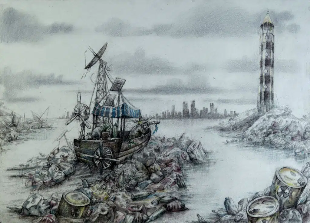 Humans have been doing things that appear to be right but have destroyed the cycle of life. We humans have a trait called self-interest that if we do not use it correctly, will destroy the world. If we use it right, we will save not only our own lives, but also the lives of all beings. Human science may become a weapon of mass destruction for all of Earth. So far, oil extraction, misuse of resources, spillage of atomic waste, and the destruction of water resources have led to the destruction of the seas and oceans. I have shown something in my art that may soon be seen. Perhaps in the not too distant future, these scenes will become normal for us. Fishes, dolphins, jellyfishes, beautiful beaches ... maybe we’ll see garbage in the future instead of the sea, and watch garbage collectors instead of fishermen. I showed an old man whose entire life fits in a boat, but still protects his dog and pots from garbage. He still wants to look at his city with enthusiasm, but regrettably, all that he looks at is a mass of smoke instead. Hoping to never see this scene ...