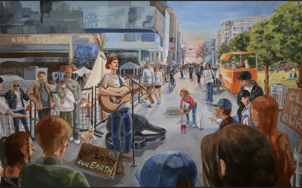 This piece was inspired by a Canadian-based musician and author, Todd MacLean. Todd has worked as a musician, music teacher, and writer. He has won a number of Music P.E.I. awards, including Musician of the Year in 2011, and is a Greens P.E.I. candidate. Learning about Todd’s accomplishments was truly inspiring, as he started his journey with street busking. Music is a powerful language that communicates effectively with many of us. Thousands of people on the streets have heard Todd’s passionate voice, lyrics, and message about the climate. Todd said, “I do have a lot of care in me as a person. And I basically need to do something with this wealth of care that I have.” People like Todd are the ones who inspire us, the ones we should recognize as heroes who change our world, although they may not be big notables. Strolling around my hometown, downtown Vancouver, I hear many musicians on the streets with messages to share, just like Todd. Let’s listen to their lyrics, and let’s Listen to Earth.