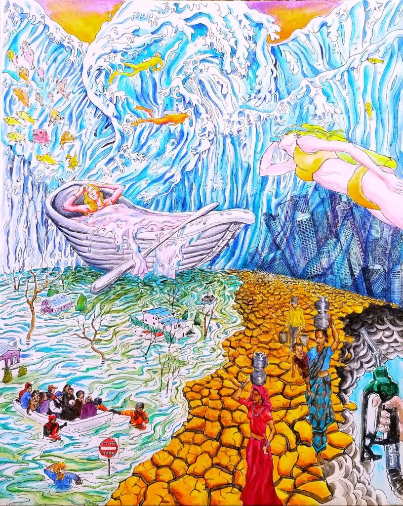 Through this piece, I wished to convey the way that climate change is intrinsically tied to social inequality, both globally and within nations. In the top half of the painting, the bright poppy colors, the sensual pose of the woman relaxing in the bathtub, the surreal situations of the overflowing water and the blown up diver suspended mid-air create a feeling of dreamlike ease, showing the ignorance and indifference in which the affluent live, shielded from the worst effects of global warming by their social privilege. The wealthy and even ordinary people in well-off countries add to global warming everyday simply going about their ordinary lives, mindlessly using fossil fuels and supporting harmful agricultural practices. Those who bear the brunt of the consequences are the poor and disadvantaged, who lack the abilities to migrate out of areas with severe climates or successfully fortify for or recover from natural disasters worsened by climate change. These people are represented in the painting by the women carrying water through a landscape shattered by blistering drought and the community victimized by flood. The beautiful colors of the rising waters behind them stand in contrast from the growing danger they hold, and the fish look cheerful in yellows and pinks even as they flee disaster, conveying the comfort of delusions for those who ignore climate change to chase money or power. Behind the water, an underground city looms, prophesying a disastrous future should things not change.
