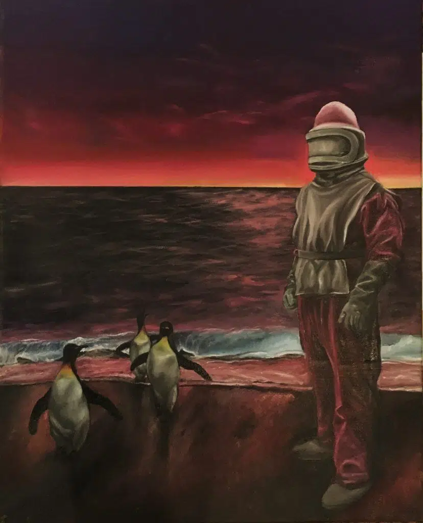 Not too long ago I was seating on a beach close to where I live, I was watching one of the stunning performances of the world, sunsets are my favorite kind of “light show” that time I couldn’t help but notice a change in the way the ocean looked. It was darker, it felt emptier, and it was surely not the same. The following day I was told an oil spill had occurred, the beautiful beach had become a pitch black painting of death. I made my painting because I felt angry towards humanity, oil spills make me ashamed of being human and not being able to ask animals for their forgives pains me. The world was here before us, we have have taken the word “intrusion” to a whole new level, it’s time for a change. I used oil paint and dark colors to recreate what I felt when the sunset changed.