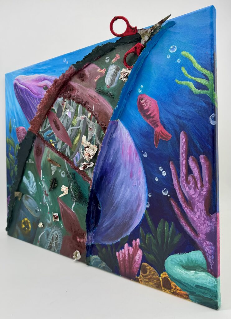 The idea for my piece came from a mix of personal experiences and creative exploration. I was inspired by Robert Swan’s quote, “The greatest threat to our planet is the belief that someone will save it.” I was also inspired by doing community service, picking up trash. Organizations have popped up, and they all do their best to lessen our wrath on the environment. As I brainstormed, I realized that destruction often goes unchecked. Waste polluting the ocean harms ecosystems, affecting both animals and humans. Through this piece, I hope to shift perspectives and inspire action. Influencing people’s points of view can make the world a better place for future generations of young rebels. Through my exploration of the contest theme, I learned that nature is not separate from us but rather a reflection of our choices. Polluting the ocean transforms it into a death zone, while caring for it brings vibrancy and renewal. My message to the world is to stop waiting and start acting. Work harder to create a better world for everyone. My piece reveals the hidden corruption in nature—the scissors cutting through show that beauty and destruction are intertwined. Without responsibility and change, Earth has no future. As Barack Obama stated, “We are the first generation to feel the impact of climate change and the last generation to do something about it.” The past has been marked by destruction, but we must step forward to address this crisis together.