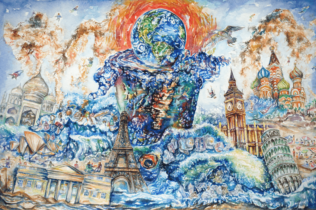 The Legend of Atlantis was always fascinating to me. That a utopian society had once existed, perhaps even still exists, underwater was something I loved to think about as a child. Part of me knew that the reason I loved it so much was because Atlantis was just a fantasy. Science and logic dictate that a living city cannot exist underwater, after all. In the United States, cities from Miami to Atlantic City, Key West to Los Angeles, San Diego to Honolulu, are candidates to become the next Atlantis. Even Manhattan, where I once lived, could soon see the day where only the tip of the Empire State Building is left above water. This was my inspiration for "Overflow." I envisioned our world as the ocean in a cup, with our Earth floating above it. When the cup of ocean overflows, human civilization will be drowned; eaten up by the insatiable hunger of the ocean as revenge on us for our abuse. Right now, we are at the turning point. The cohesive surface tension of the cup is keeping the Earth afloat; but once it topples... That is the message I would like to convey.
