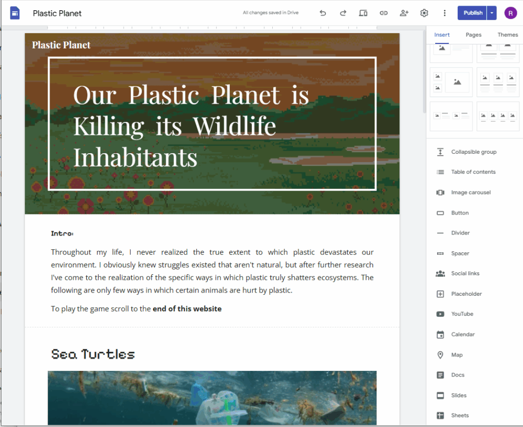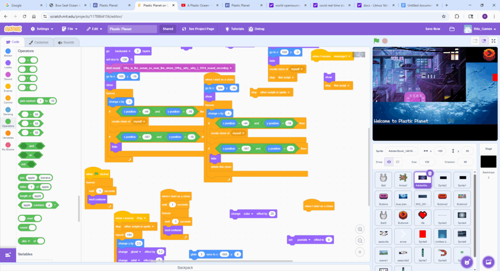Project Description: My website includes few sources of inspiration towards my final game as well as short descriptions of the struggles certain wildlife have to endure throughout their lifetime; the same wildlife are included in the main game. The game is located near the bottom of the website and starts at the press of the green flag where it then transitions into the intro. Here players must press the “Play” button to continue further. The intro then transitions into the player (or in this case animal) selection slide. Here players can choose which wildlife perspective they want to try. Note that the game doesn’t delve completely into the lives of these wildlife creatures but instead the specific hardships they endure when it comes to deciphering food from plastic. Players can choose between “Sea Turtle”, “Bird”, or “Krill”. While these three animals all face the same hardship of mistaking plastic for food, they encounter this issue in different ways. Sea turtles for example have a hard time telling the difference between plastic bags and jellyfish. Birds often mistake shiny plastic for certain bugs. Finally, krill (who are extremely unable to tell the difference between microplastics and phytoplankton) consume plastic regularly and produce nanoplastics. It is almost inevitable for krill to not each microplastics as there are billions upon billions of them constantly floating on the ocean’s surface. Each game type uses different input. For “Sea Turtle” players must drag their finger or mouse across the screen in order to dodge or eat things. “Bird” doesn’t include any movement and instead only requires clicking. “Krill” includes movement in all directions, and you can only eat by touching food. You are only given two lives, meaning if you eat plastic twice in one game, you have to start over. Unfortunately real animals usually die from their first major plastic encounter but for the sake of the game I’ve given the player two lives. I made this game using Scratch, an app/website where you can construct games using block-code, and while the code itself is quite simple, Scratch is meant for small, short games and there forth only allows simple logic. In order to make my game a little more intense I had to use more block codes to do more complicated functions which could’ve been very simply done in any other software. For example, Scratch doesn’t allow videos, so in order to make certain backgrounds move I had to convert my videos into hundreds of little pictures such that it easily animates when played. Once I had published the game, I embedded it into a website I made on Google Sites where I included all extra information about the game. I recommend this game be played on phone but any device works.
