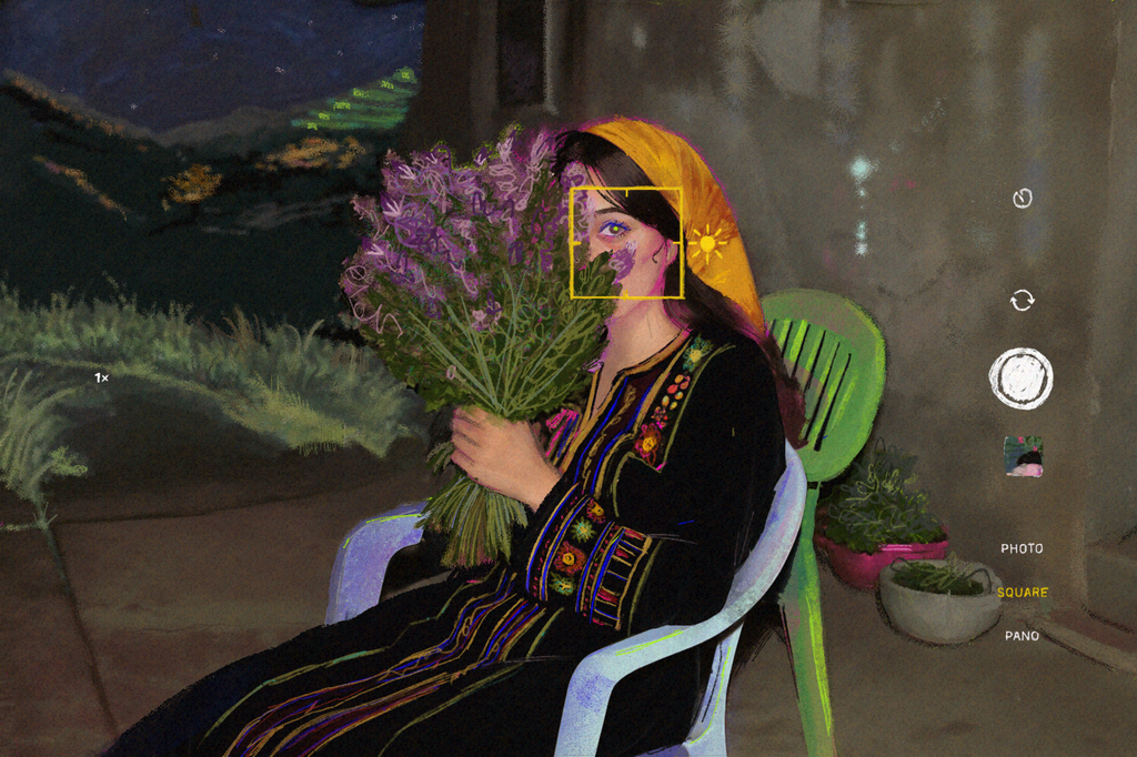 There’s an idea that technology, urban life, and nature are naturally at odds. However, in Asir—a mountainous region in southwestern Saudi Arabia—that division doesn’t exist. Quite the opposite. My goal was to show how communities like mine live at the intersection of all these things—nature, culture, and technology. The concrete walls, plastic chairs, flash photography lighting, and phone camera overlay are oh-so “unnatural”. Yet she’s surrounded by nature: a bouquet of rāhan, often called the ‘Asiri Dolls’, partially covers her face. We as humans usually consider the face the most important part of the self. The fact that half of hers is covered shows the connection with nature. The Asiri people—unlike many other Saudi groups—are named after the land, not a tribe. Much of our identity is tied to the environment. Also al-ibra is lovingly planted behind her. I used painterly and pixelated brushes to reflect the balance between the organic and the digital. Neon colors contrast muted natural tones for the same reason. The phone screen is crucial: before smartphones, very little of Asir was photographed in all its colorful glory. Now, not only is the landscape being captured—its people are too. Someone is taking her picture, and in the “recent photos” album, children look over the highlands. There’s connection happening. The landscape is based on real views from Asir, where urban lights don’t drown out the land—they sit within it. Places like Al-Jabal Al-Akhdhar glow neon at night, all of Asir does. Asir is called the “land of color” for a reason. This piece taught me that sustainability isn’t just environmental, it’s cultural. Preserving identity, especially in underserved regions, IS climate work. Also through creating this, I realized how deeply I rely on the land to feel whole, I realized I was showing my own place within it.