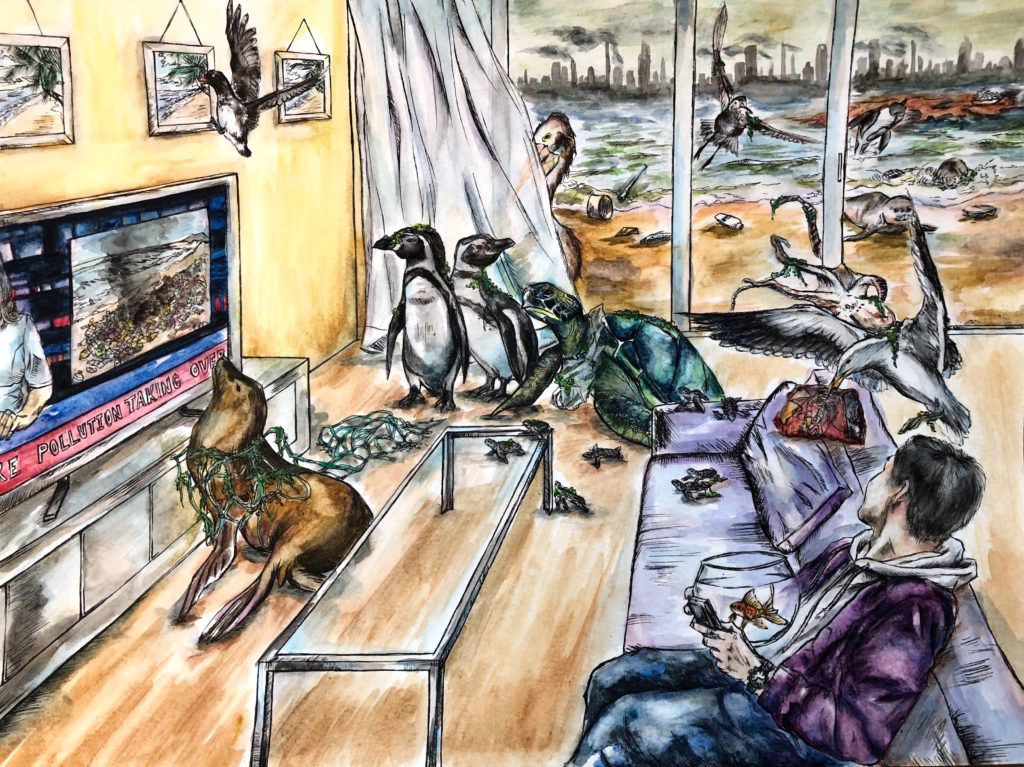 We are facing one of the biggest problem in our lifetime: climate change. Climate change poses as a threat to our environment, the ecosystems, and our very own health. This dire situation will lead to huge consequences which makes me wonder why aren’t we addressing the situation as a vital problem. In my art, I illustrated a variety of morose-looking marine animals crawling into a person’s house to seek refuge from the deteriorating state of their own home. Most animals are covered in algae from an algal bloom, caused by the rising ocean temperature from climate change. The scenery outside shows the unending fumes of pollutants released into the air, which is a well-known major cause of climate change. The boy holding the fish bowl filled with clear and clean water represents each individual and their action taken to help the situation. Now, let us ask ourselves, if we are not willing to house the animals whose homes we have destroyed, what can we do to prevent it from even happening?