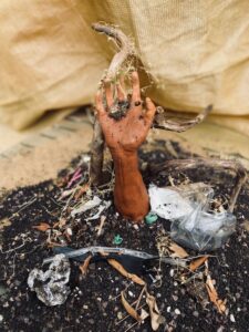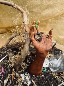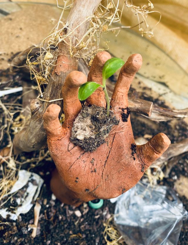 I created this sculpture about resilience because I wanted to express how pollution has affected me and the world around us. I began to see more and more waste piling up all over spots that used to flourish with nature. Now, when I look at nature, it’s not the same healthy natural environment it was before, it’s a fragmented reflection of what it used to be. For the Ocean Awareness contest, I chose to make a sculpture because I am taking ceramics class at school right now and I feel it's a very visual and fun way to show and express my creativity, which makes me joyful. I was inspired by the hand positions of the hand arches seen in paintings of the sistine chapel, so I crafted my own variation. I sculpted an uplifting hand out of terracotta clay to symbolize a will to restore nature. The small sprout represents a fragile but strong willed resilience, and I decorated the background with debris of trash I found in nature to show what pollution truly looks like. I also added a large piece of driftwood along with dried plants to express a dead and withered tree to dramatically contrast the polluted Earth to a living sprout. This sculpture means a lot to me. It’s not just about my own feelings, but I yearned to make a statement for this contest. It’s depressing to see that mankind has done this to our own home, but it is also hopeful to feel the strong resilience of Earth. Even though the malnourished soil and the pollution chokes out the body, the hand and the little sprout represent a chance. When all ideas have been drowned out, there can and will only be a remainder for hope, and a symbol of resilience.