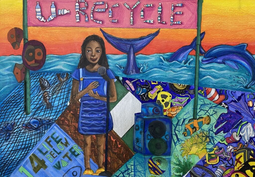 “Speech” is an action so simple yet impactful enough to connect people all around the world. One of the main activists in my work, Oluwaseyi Moejoh, is a young 20 year old Nigerian law school student who speaks to the public regarding climate change and ocean preservation issues. Through working together as a community, I hope this art piece connects people of diverse cultures and leads them to realize the importance of ocean awareness through the message of speech since art has the pure power to raise awareness. Oluwaseyi Moejoh is standing on the platform of all kinds of waste which also connects to her organization, the “U Recycle Initiative Africa.” The platform consists of piles of waste and shattered transparent glass which helps look into the ocean and observe the struggles that the marine animals are facing due to the plastic connected chemical pollution. There are mutant fish inside the shattered glass, putting emphasis on the critical issue. Additionally, the platform includes a Nigerian flag and Nigerian tile patterns which connects back to the environmental awareness of the U-recycle Initiatives. Each marine animal in the art piece is either critically endangered or supposedly extinct. In order to ensure the resilience of the marine ecosystem and warn the people, the speaker delivers her important message on the waste pile. While researching the climate heroes hidden under the light, I found out that the collective actions are the ways of protecting the environment as there are several climate heroes making small but impactful efforts to our world. There is no Planet B, we as humans should have the responsibility to keep our one and only earth alive.