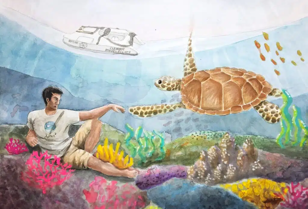 My painting shows humans and turtles living in harmony. This scene is a modern take on The Creation of David by Michelangelo, featuring my chosen climate hero, Mr. Sidhant Gupta. He is the founder of Clearbot, a self-operating marine robot that harnesses advancements in technology and AI. Mr. Gupta reaching towards the green sea turtle symbolises the interconnectedness between people and our oceans. It captures the urgency of our current environmental crisis and for us to step up in taking action to effect change that would would otherwise result in irreversible destruction to our planet. Bright colours are chosen to depict the vibrancy of life and a sense of energy that still exists in our world, despite being fast-disappearing. This work acts as a reminder of how we all have the power, even as individuals, to take action and make a difference no matter how small. It is a reflection of what we have done to the world around us and how we have the power to take steps towards positive change.
