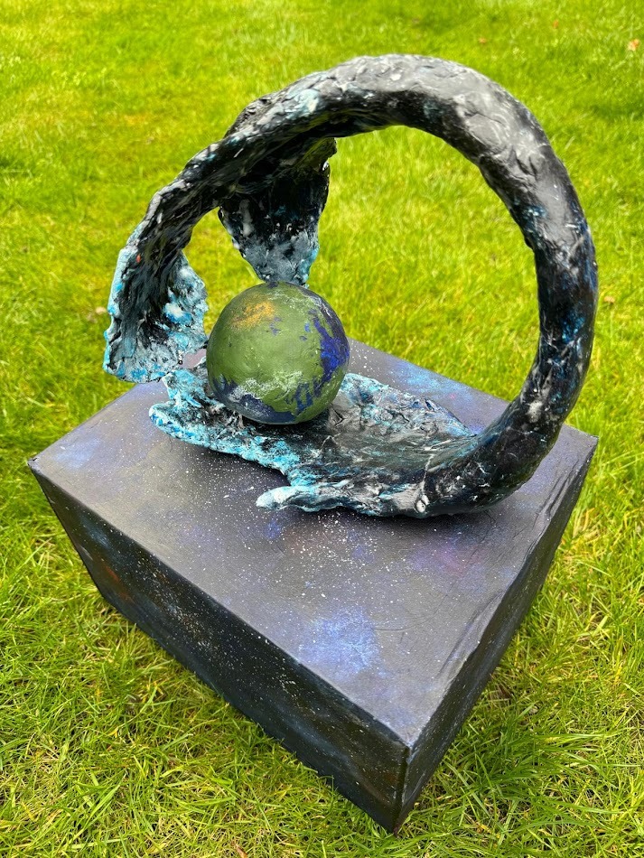 Although most are caused by tectonic activity, climate change can also contribute significantly to the risk of Tsunamis. Rising sea levels coupled with the impact of landslides and melting ice caps all contribute to the increased incidence of tsunamis. My sculpture shows a tsunami that is so immense that it engulfs the planet earth. Although deliberately exaggerated to reinforce the potential dangers of climate change, I feel that it tells a very real story and sends out a stark warning about the dangers of climate change. I have created the tsunami to represent the hands of climate change, and to demonstrate its ability to overwhelm and engulf our planet. I have used dark colours to generate an ominous mood, however have used light blue at the ends of the hands to show oceanic crust encircling the globe. This has been created to reflect my fear of global warming. I discovered in my Geography lessons that if sea levels continue to rise, communities along the coast globally would be at increased risk of the effects of tsunamis. Even small rises in the sea level can force tsunamis to travel further inland and cause more devastation to peoples’ property and lives. My purpose is to raise awareness of these potential issues, which pose a grave danger in both the short and long term to people worldwide. I wanted to demonstrate immensity in combination with a warning to people of the importance of respecting the dangers of nature and natural disasters. I would subsequently hope that anyone who saw my work would note the importance of putting in place proactive ways of reducing the risk of tsunamis by addressing global warming, and its risks.