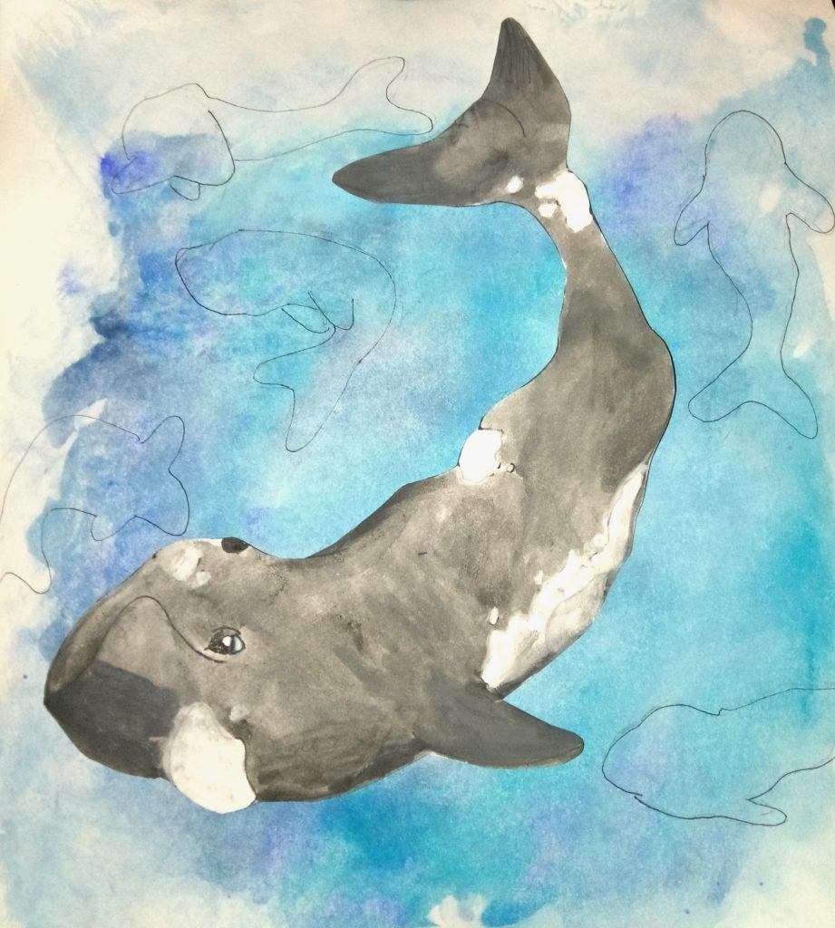 I created this piece of artwork because I really care about the well-being of all animals, especially endangered ones. I used watercolors and outlining pens to create the borders and colors. In my piece, the symbolism of the whales being endangered is in the empty whale outlines. They are supposed to represent the whales of the past that have gone missing, and that the remaining ones are all alone. I have learned through my N.A.R.W. (North Atlantic right whales) research that they are called "right whales" because of how good and easy they were to hunt, but now they are endangered because they have been over-hunted. I will personally take responsibility now to do as much as I can to raise awareness for these gentle creatures. Saving the right whales is the right thing to do.