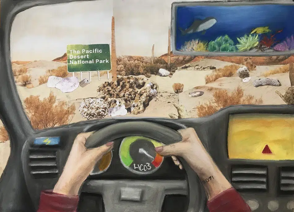This piece of artwork is inspired by what I learned in science class. I learned that land could change over time, and so I thought, "What if the ocean dried up because of global warming?" The message I wanted to send through this piece is that we need to start taking action to help our planet. I think that a small action helps too, as long if we all do it. A drop of water can't form the ocean, but billions can. In this project I learned that billions of pounds of garbage pollute the ocean, and the problem is getting worse and worse. My only hope now is that more and more people start acting, and the government finds a better way to get rid of the garbage. After what I've learned, I will pick up garbage I see and garbage of my own next time I go to the beach , eat less seafood, not buy any coral or decoration that come from the sea, and use less plastic. Also, I will encourage my friends and family to do it too.