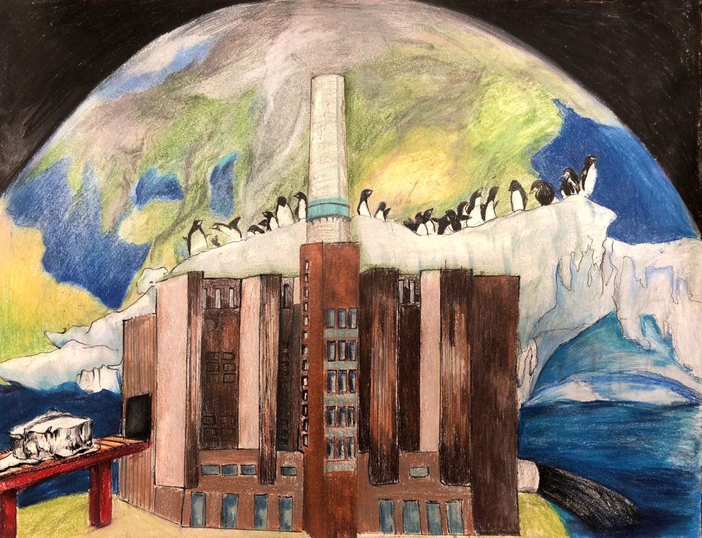 Factories with the newest technology produce 75,000 tons of Carbon Dioxide. The factories without the newest technology produce even more than that. Most of the carbon dioxide goes to the natural carbon sinks on the Earth. The ocean, one of the Earth’s largest carbon sinks is being strongly affected by the surplus of carbon dioxide in the air. Having to store this much oxygen creates problems for the ocean. The ocean acidity increases and the temperature of the water increases, causing many organisms that live in the sea to be affected. My drawing has the factory in the foreground, an iceberg with penguins in the middle, and the Earth in the background. This shows how many companies put their factories and assets before saving species and the Earth. The ocean is about to cover the island because the ocean level is rising.