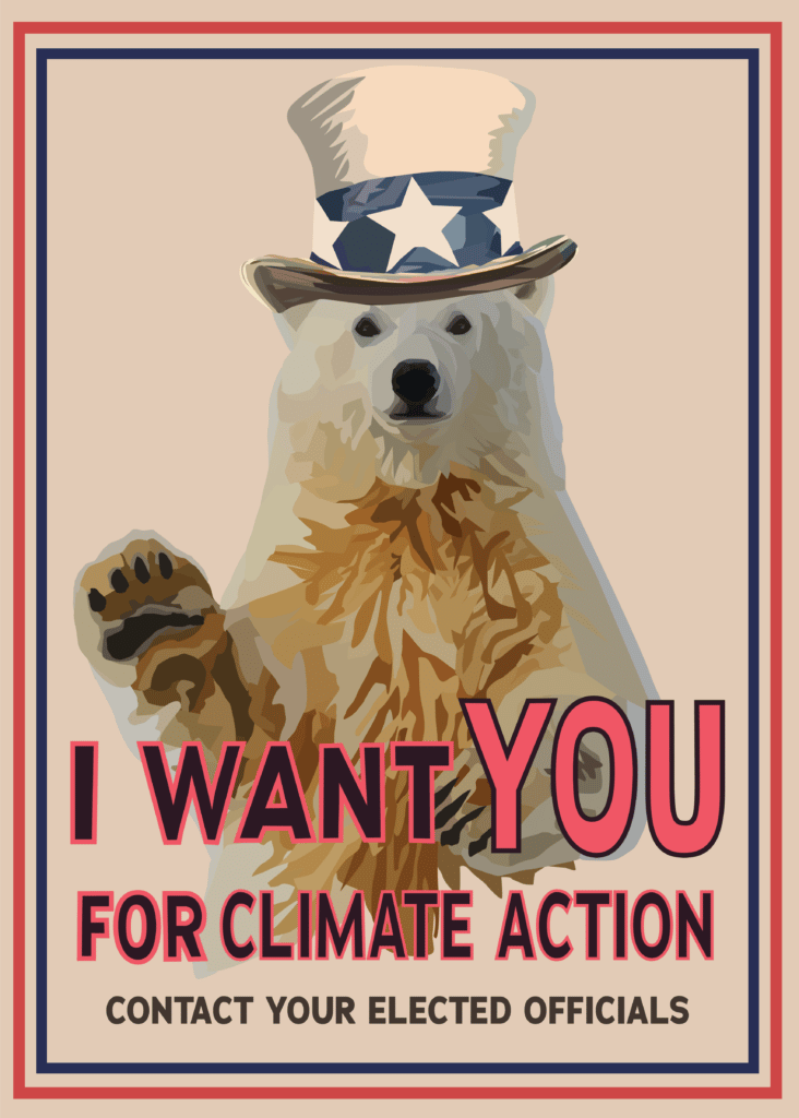I wanted to convey my idea of taking on vintage draft posters from the U.S. in order to grab your attention. Through my exploration of the Contest theme, I discovered the many impacts of fossil fuels and other oil contributing to the melting of the polar ice caps. That partly inspired my idea, because a polar bear is a recognizable animal that is endangered due to climate change. The main message of my artwork is to get the viewer to take action.