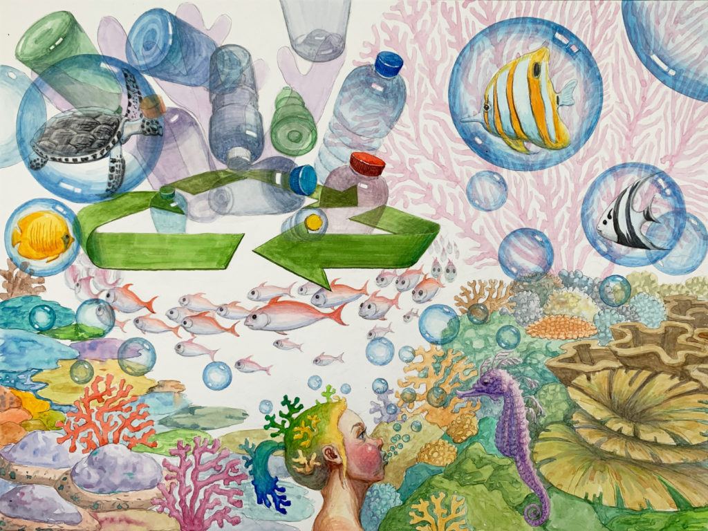 What a beautiful mysterious ocean with so many different colors and shapes! We're all connected to such a beautiful ocean. The Earth is a blue planet with more than 70% of its surface ocean. Our blue planet needs our awareness and protection more than ever. Saving the ocean is a very important factor in overcoming the climate crisis. The amount of oxygen that the ocean produces through photosynthetic plankton is enormous. Not only does it provide the oxygen that sea creatures need to live, but it also allows land animals and us humans to live and breath. In short, the ocean can help transform global warming. I chose watercolors for my piece to express the mystique of the ocean and combined colorful colors to capture its beauty. Then, I depicted our various efforts to protect the sea through the plastic disposable water bottles and the recycling symbol. When the beautiful oceanic fairy at the bottom of my piece spews oxygen, many sea creatures are alive and breathing inside the oxygen bubble. When our ocean comes back to life, so will our blue planet, and we will be able to enjoy being with the beautiful nature.