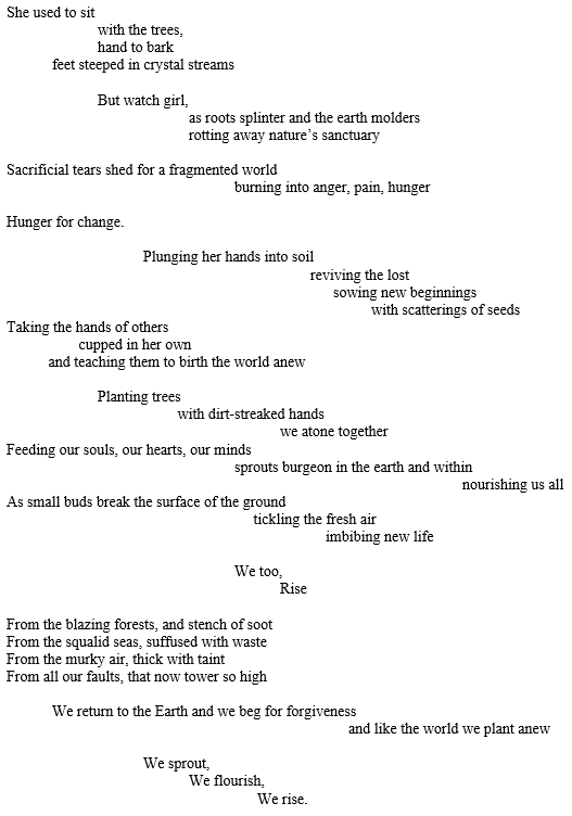 I have always believed that to solve issues, we must find their roots. Regenerative agriculture is one of the parts of eco-activism that I am most intrigued and inspired by. This system doesn't just examine the roots of environmental problems, but cultivates new ones to create solutions. When searching for eco-activists who utilized nature itself to combat climate change, I came across Elizabeth Wathuti's 2021 UN Climate Change Conference speech. Wathuti spoke about the calamities in her homeland of Kenya that had been instigated by climate change, including droughts, deforestation, and starvation. I began researching her organization, the Green Generation Initiative. I was amazed by how the Initiative engages youth in more than 35 Kenyan schools. Through her Eco Schools Program, students learn regenerative farming techniques that promote food security and help local communities. I have always enjoyed writing poetry, and I found Wathuti's expressive and eloquent speech energizing. I was deeply moved by reading about how she spent time absorbing the natural beauty around her home as a young girl, and how the effects of climate change devastated her, forcing her to watch that beauty wither away. In her 2021 UN Climate Change Conference speech, Wathuti emphasized the importance of unity and persistence, stating that "People who truly understand why this work is really important need to also continue putting up so much pressure on everyone... we need more people who care and are concerned about the planet to join this movement and make sure that we are holding everyone accountable." It dawned on me that Wathuti wasn't just planting trees. She wasn't just sowing soil. She was planting new ideas, new solutions. She was helping people sprout and grow in a new and better way. Because eco-activism isn't just about reversing the horrific effects of climate change; it is about changing ourselves as a collective human race to ensure that we never again make the same mistakes that induced this devastation in the first place.