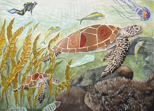 This piece, a 2024 Ocean Awareness Contest winner, uses the image of the artist pulling burned buildings out of the ground to show how people are both affected by and responsible for wildfires and climate change. The real net and leaves in the artwork stand for how we are all tangled up in this problem, helping Meilin successfully establish a connection with recycled materials and advance her idea. Meilin says, “I hope to warn people about the detrimental imprints humans leave and inspire others to improve the environments they cherish.” Her own experiences escaping wildfires made her want to inspire action and show that anyone can help restore the environment.