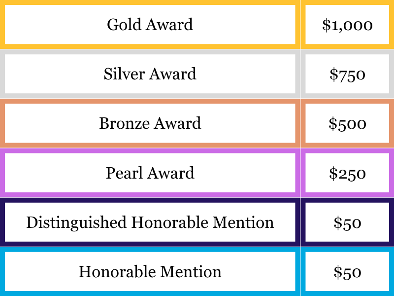 Cash awards are presented to winners in all of the categories at both the Junior and Senior Division levels. There are no requirements for what you must do with your cash award; we hope that you will use it to further your passion for the environment and your creative talent.